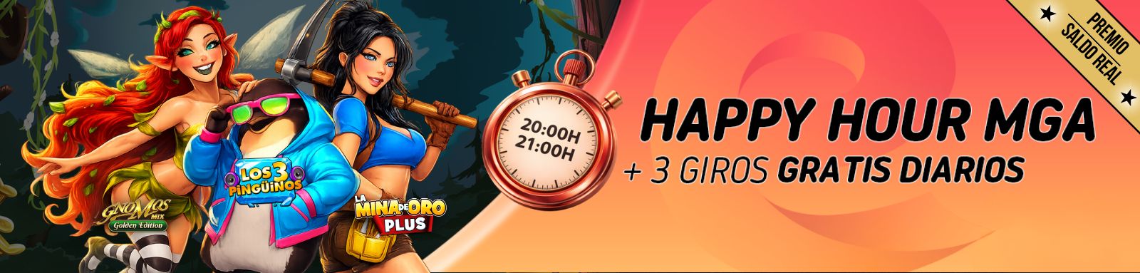 NUEVO HORARIO: Accede cada día de 20:00h a 21:00h a cualquier slots de 3 rodillos de MGA y, si eres uno de los 100 usuarios más rápidos recibirás 3 GIROS GRATIS en saldo efectivo.
