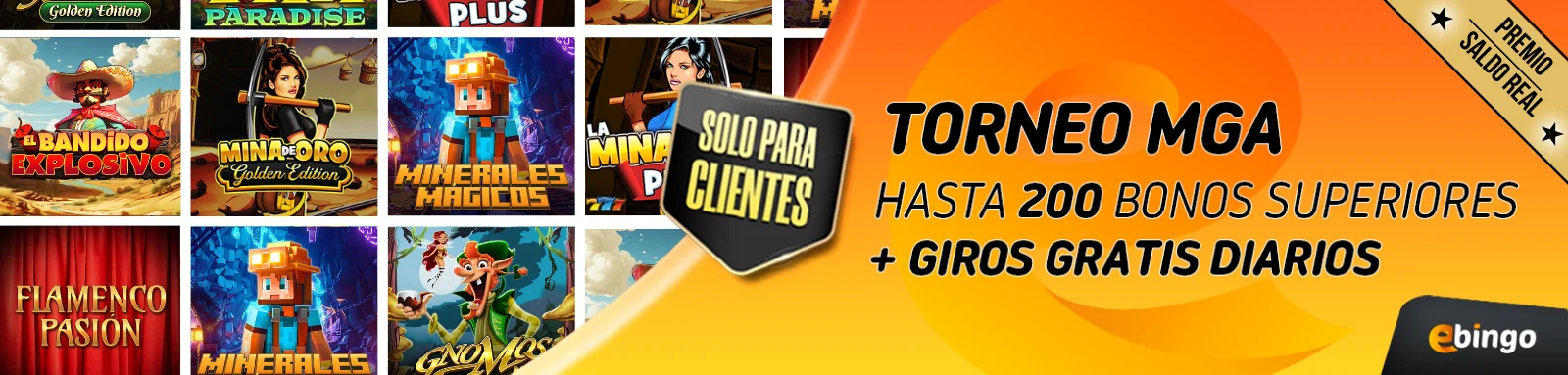 - En el Torneo entran las siguientes slots de MGA: Bandeido Explisivo, Bandido Explosivo 2, Flamenco Pasión, Mina de Oro Golden Edition, Gnomos Golden Edition, Minerales Mágicos y Mina de Oro Plus.