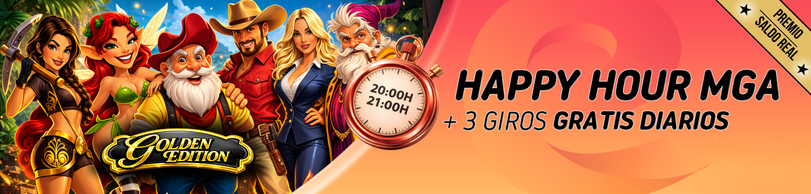 NUEVO HORARIO y SLOTS: Accede cada día de 20:00h a 21:00h a las slots GOLDEN EDITION de MGA y, si eres uno de los 100 usuarios más rápidos recibirás 3 GIROS GRATIS en saldo efectivo.